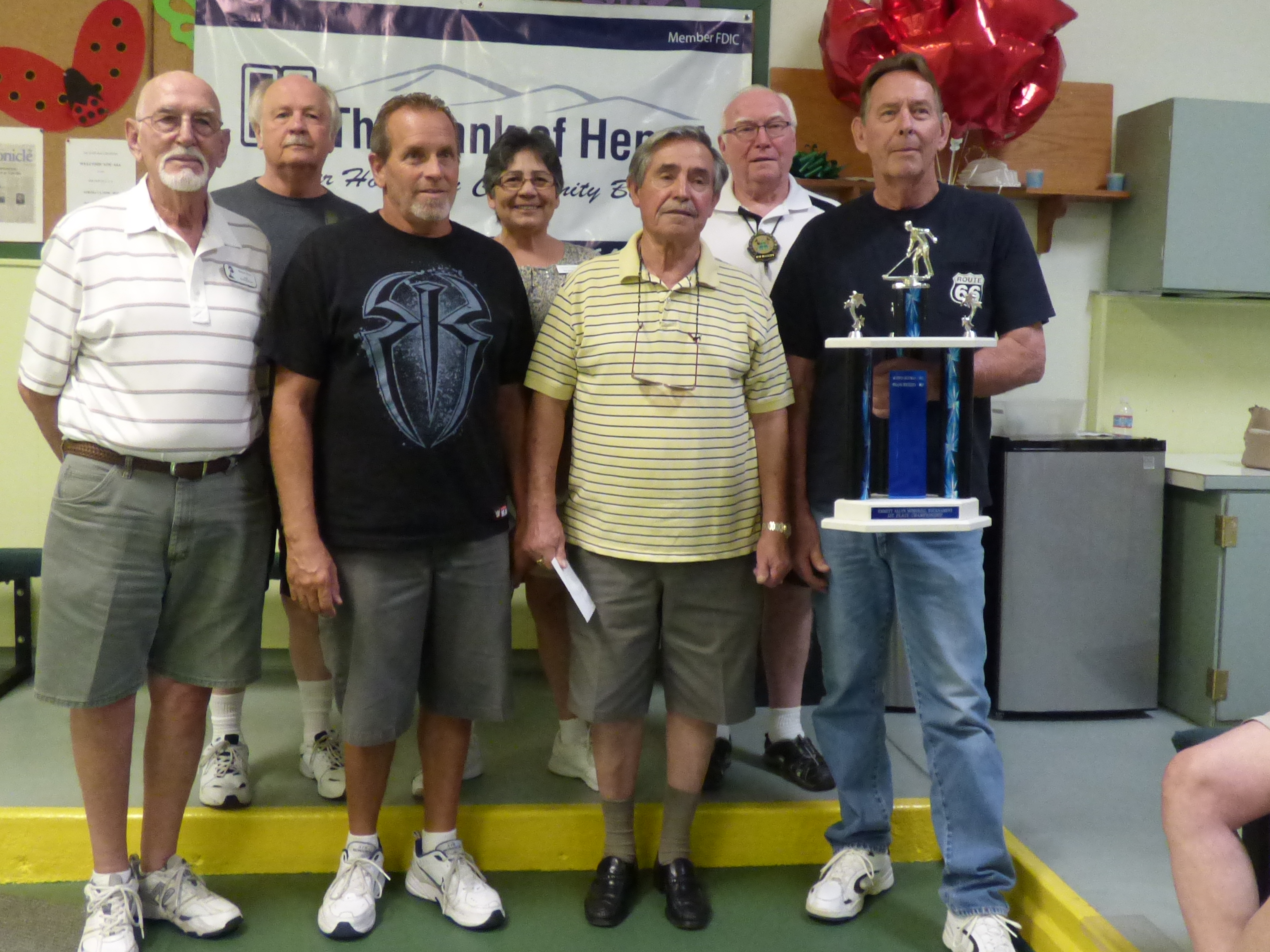 Memorial Venue Hosts Acclaimed Tournament by Dean Grattidge District 7 Reporter For the third year the Seven Hills Resort proved to be a venue for the much-anticipated Emmett Allen Memorial Shuffleboard Tournament. This event took place from June 29th to July 2nd, 2015, with 72 players on deck. We were privileged to have The Bank of Hemet as a financial backer as well as the fees paid by players. The site, now designated the “Emmett Allen Memorial Shuffleboard Court” was endorsed by the contestants. The games were 12-frame, played under CSA rules. The event brought out he best from senior and new players, alike. Numerous volunteers contributed to the success of these District 7 early summer games. ATM’s were Sharyn DiChiro and Helen Noeltner who also created and maintained the charts. Club president Suzanne Shapiro was constantly on hand as facility director. Head ref was George Hayner while Karla Winget supervised the collection and accuracy of the score cards. A board crew, maintaining the integrity of the courts was made up of Ron Needham, Chuck Davis, Everett Harbison and Minda Needham. We thank all, along with Jerrie Stutes and Donalee Allen for canvassing the neighborhood merchants for many exciting door-prize gift certificates. We also thank Polly English for fashioning a fine payoff from tickets sold on the Lei cash drawing. Kudos to Len Sweet for construction of the Hawaiian Lei. Suzanne Shapiro an Mary Davis persevered in “setting the table” and offering many outstanding lunches for each of the 4 days. Local businesses contributing to the door prizes were: Farmer Boys, Dicky’s Barbecue,, Walmart. I-Hop, Sweet Baby Jane’s Barbecue, Stater Brothers, La Fogata Mexican Restaurant and Marie Callender’s. In pursuit of excellence, these 8 winners of pins and cash awards have etched their names Into the record books — Championship round: First place, Harry Gregory, a rookie from El Grande Estates, with his first championship, second place, Tom Armijo (Sun City), third place, Bruce Kiefert (Golden Village Palms) in his first tournament win, fourth place, Jay Davidson (Hemet West).
