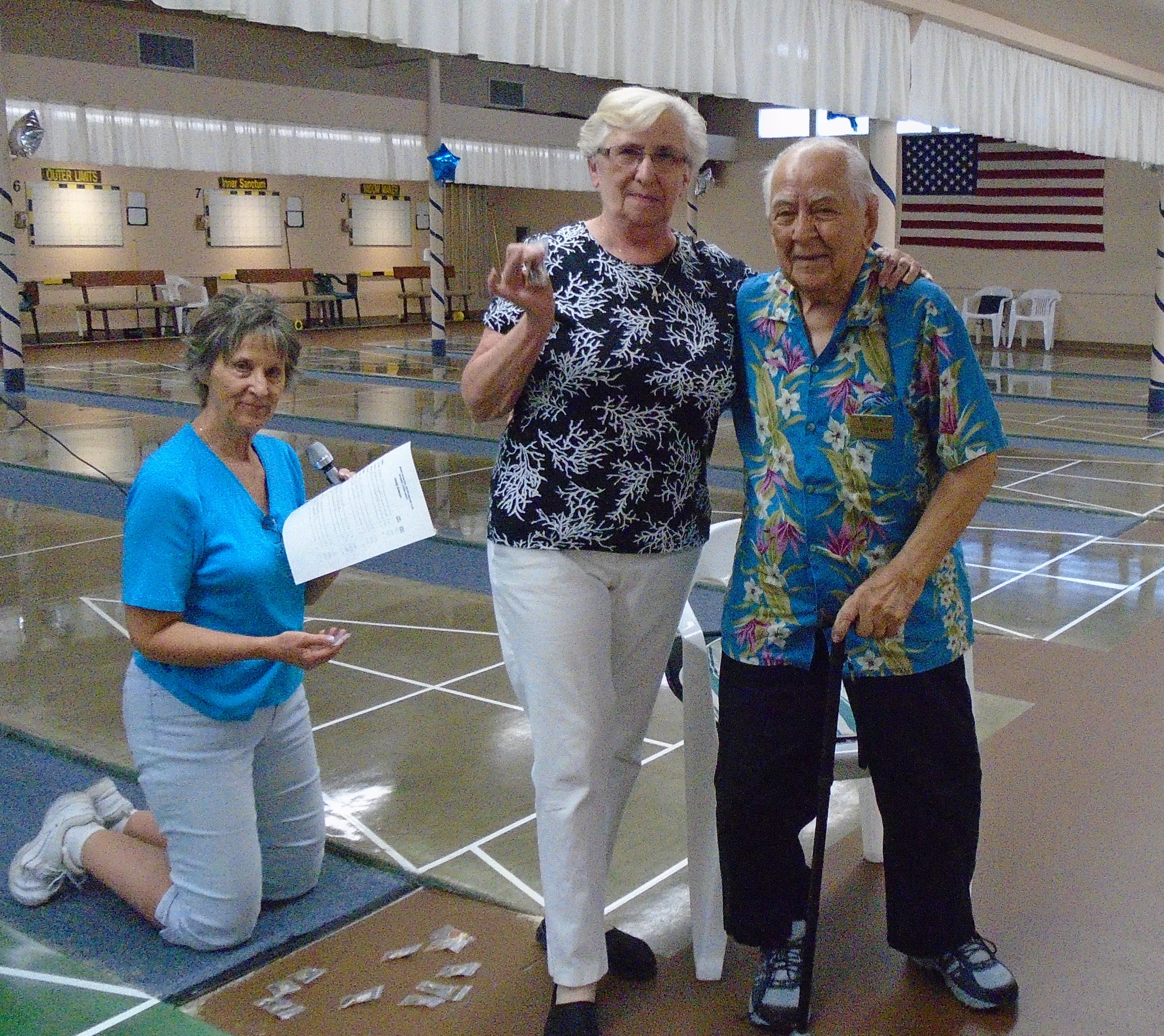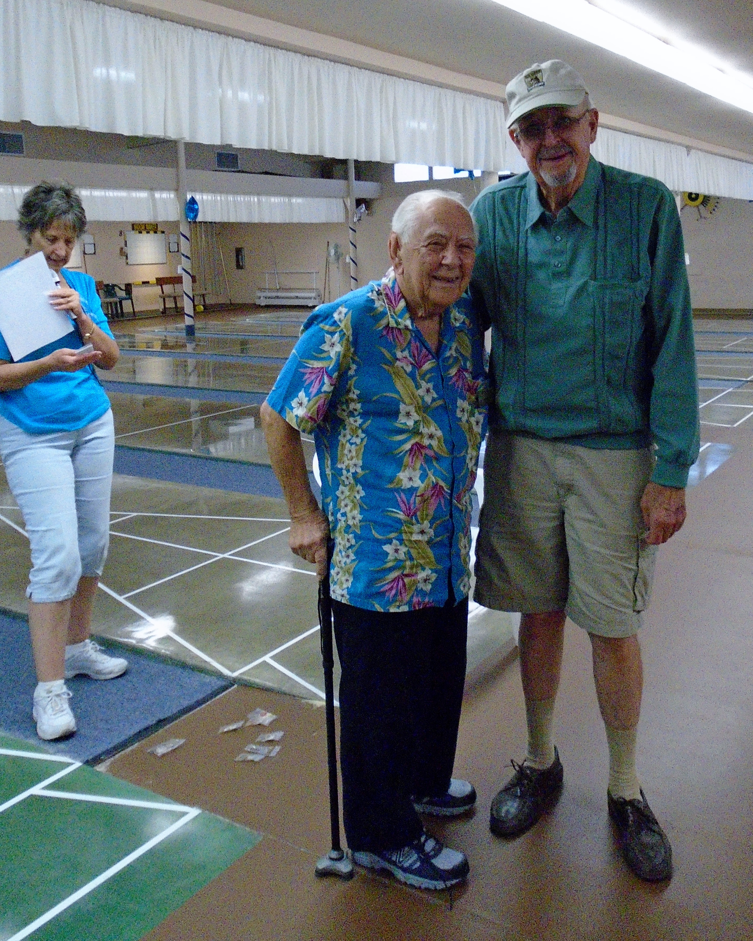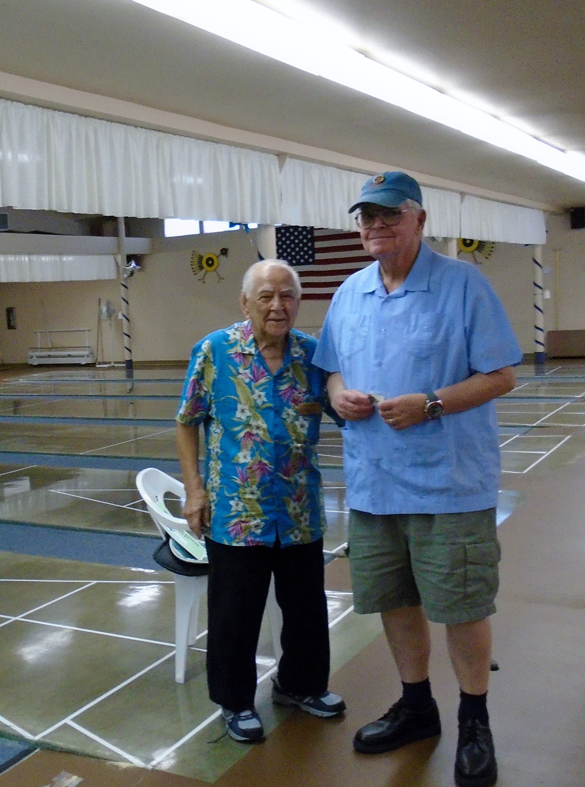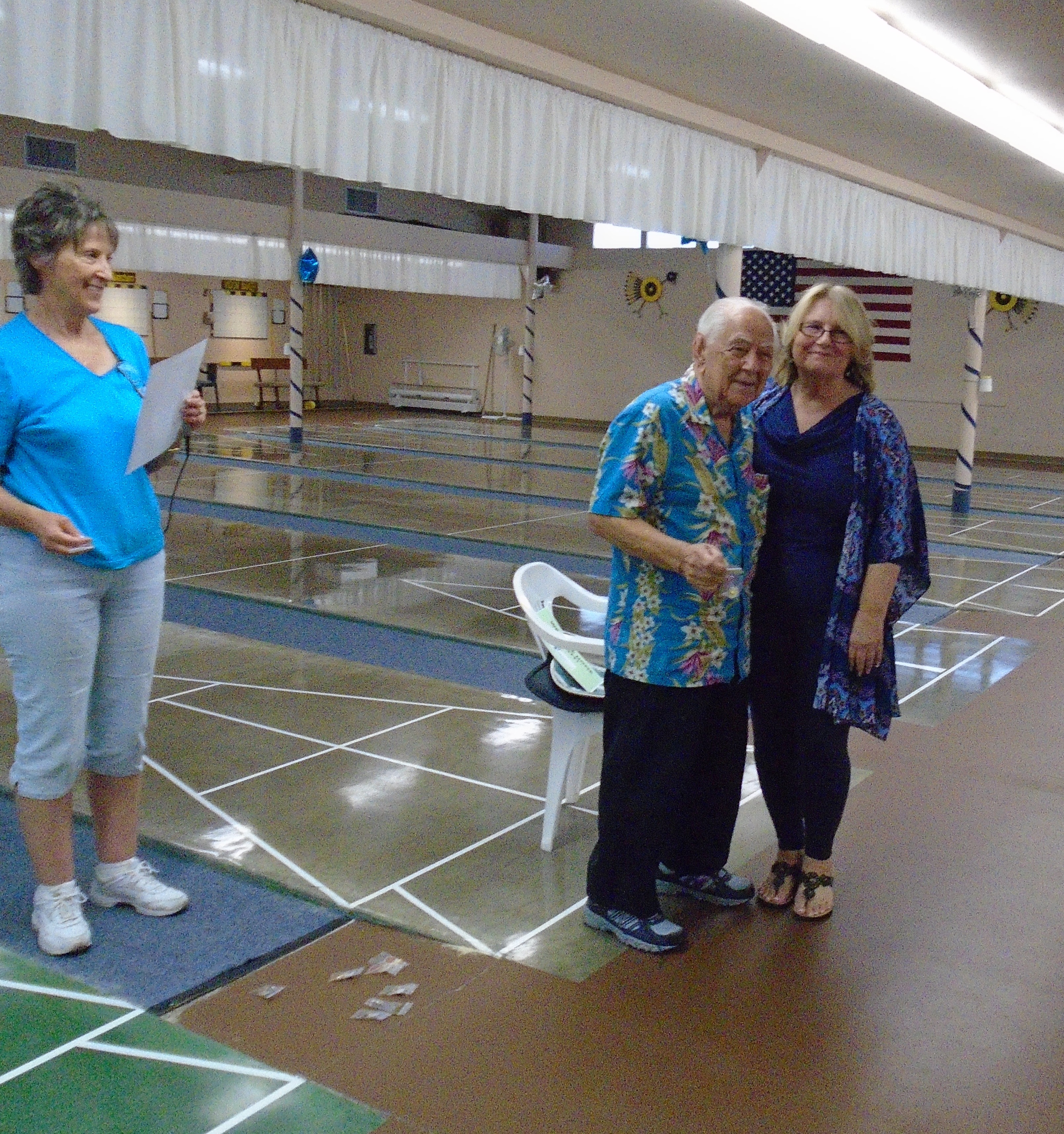 The 20th Annual Bonspiel Shuffleboard Tournament was held on July 13th, through July 15th, at Hemet Municipal Shuffleboard Courts. Atm’s in Charge of the scheduling and recording the results of each game were District 7 Tournament Director Sharyn DiChiro and her assistant Lynda Goggin. They did an outstanding job keeping the games running smoothly and on time. As Hemet Municipal Shuffleboard President, Carol Anderson with her expert crew of helpers organized delightful and nutritional lunches each day. Everyone was excited and honored to have the Founder of the Hemet Municipal Bonspiel, Marty Boyajian in attendance and playing once again with all his friends. It was a joyful time for all. The Bonspiel is a very different type of Tournament, which is only played once a year. There are four divisions, decided by wins and losses the first day. No one is ever eliminated, all play two games each day. If you win both games the first day you enter the Red division. If you win the first game and loose the second game you enter the Blue division. Players losing the first game but winning the second game are in the Green Division. Those losing the first two games remain in the purple division. The most appreciated part of the game is there is no penalty for landing in the kitchen. Players may accrue 30 extra spread points each game above their opponents score. Of course your opponent tries to take your scores out. It makes for an interesting and fun game. Players get 2 pts for each win. Final results total up the game winning points and the total of spread points for each player, making the play more equal for all. Carol Anderson assisted by Marty presented the pins to all winners, who will also receive the ever popular Bonspiel vest. The winners for the 2015 20th Anniversary Bonspiel were: