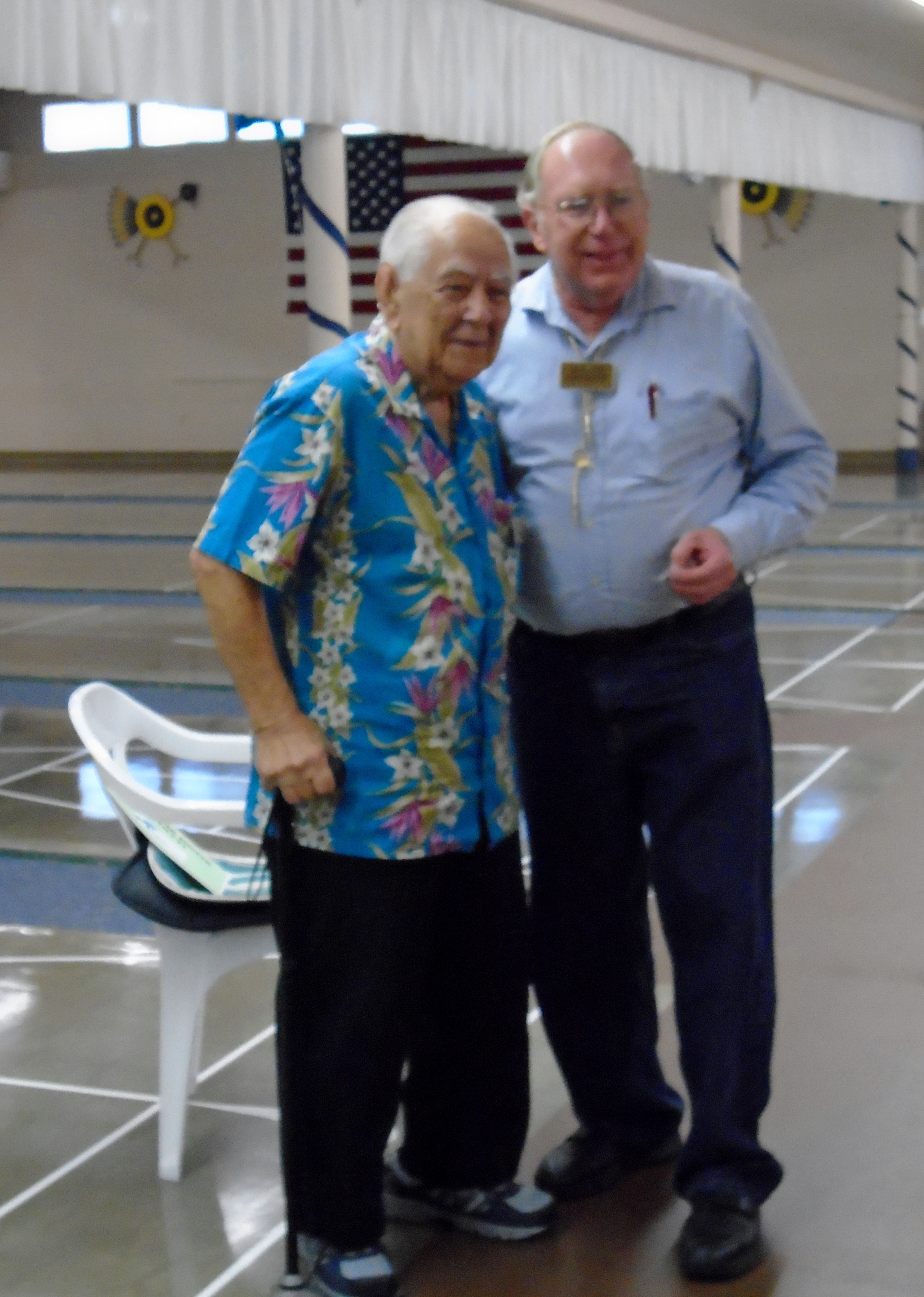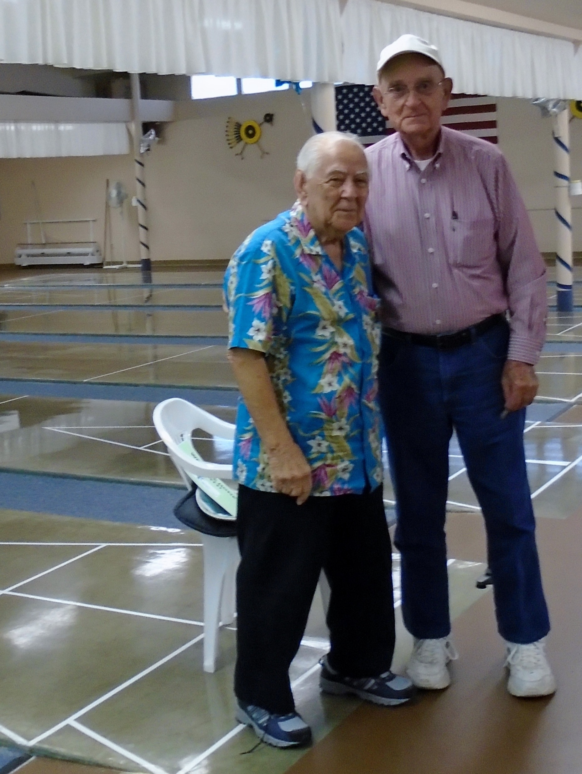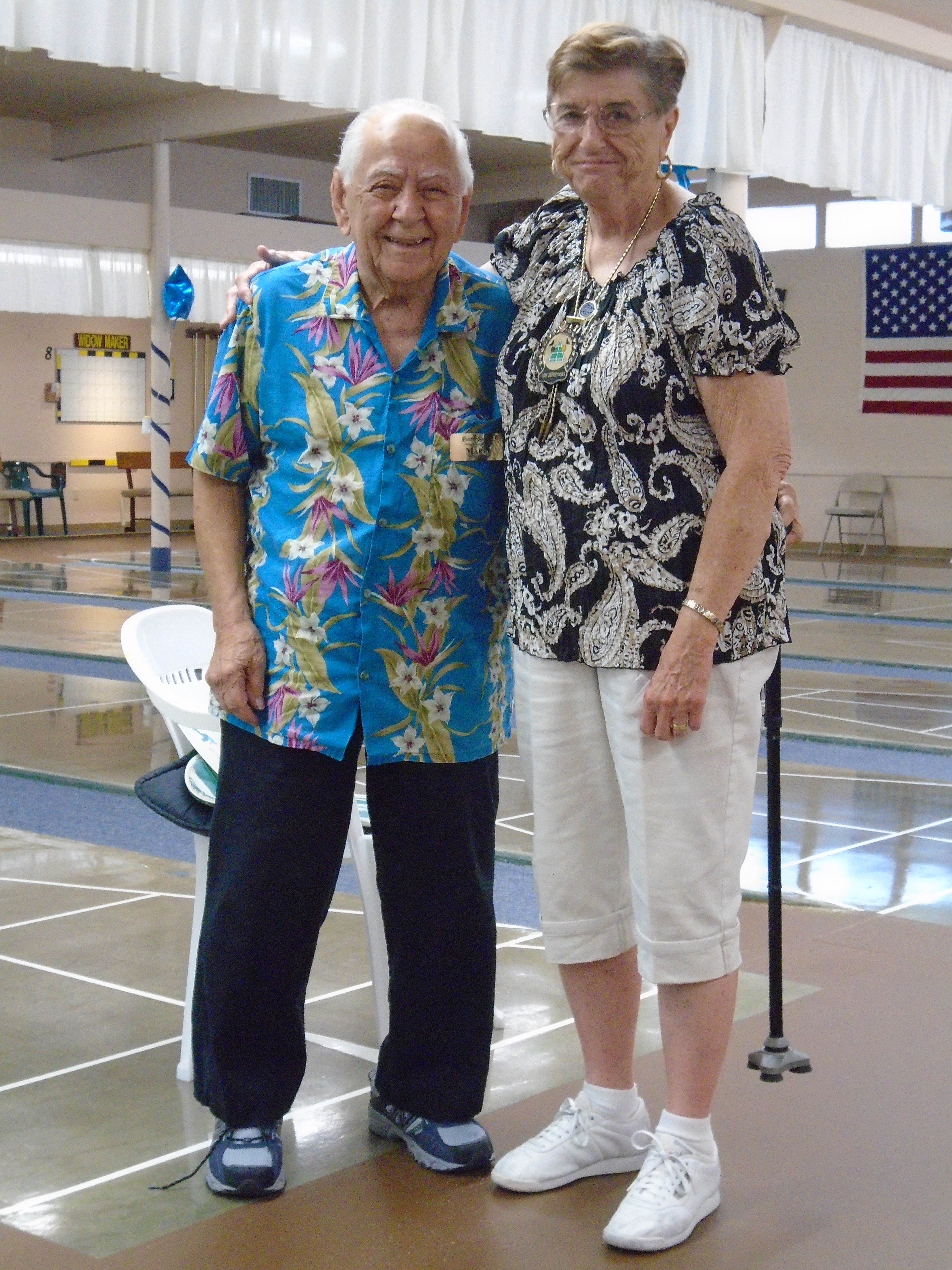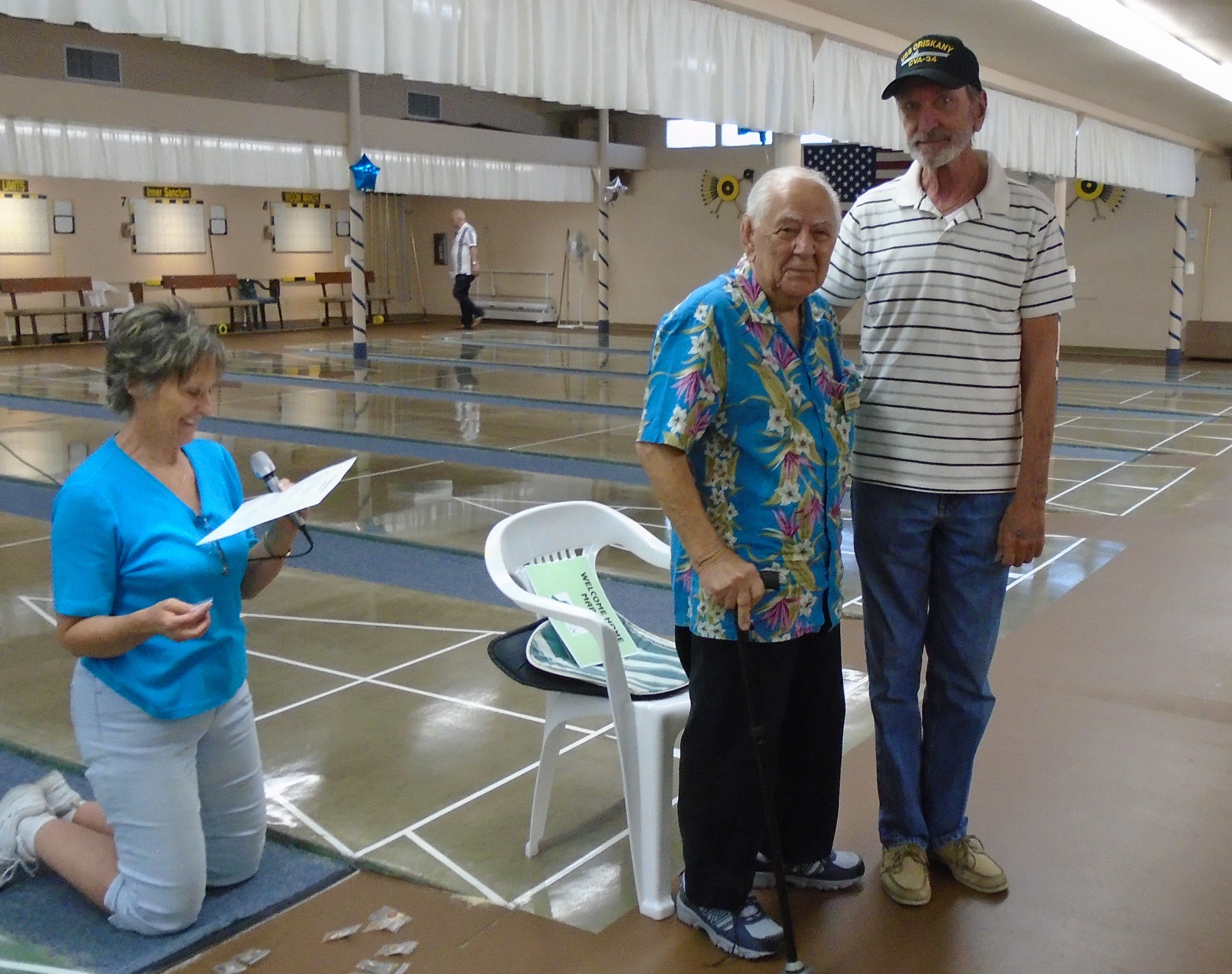 The 20th Annual Bonspiel Shuffleboard Tournament was held on July 13th, through July 15th, at Hemet Municipal Shuffleboard Courts. Atm’s in Charge of the scheduling and recording the results of each game were District 7 Tournament Director Sharyn DiChiro and her assistant Lynda Goggin. They did an outstanding job keeping the games running smoothly and on time. As Hemet Municipal Shuffleboard President, Carol Anderson with her expert crew of helpers organized delightful and nutritional lunches each day. Everyone was excited and honored to have the Founder of the Hemet Municipal Bonspiel, Marty Boyajian in attendance and playing once again with all his friends. It was a joyful time for all. The Bonspiel is a very different type of Tournament, which is only played once a year. There are four divisions, decided by wins and losses the first day. No one is ever eliminated, all play two games each day. If you win both games the first day you enter the Red division. If you win the first game and loose the second game you enter the Blue division. Players losing the first game but winning the second game are in the Green Division. Those losing the first two games remain in the purple division. The most appreciated part of the game is there is no penalty for landing in the kitchen. Players may accrue 30 extra spread points each game above their opponents score. Of course your opponent tries to take your scores out. It makes for an interesting and fun game. Players get 2 pts for each win. Final results total up the game winning points and the total of spread points for each player, making the play more equal for all. Carol Anderson assisted by Marty presented the pins to all winners, who will also receive the ever popular Bonspiel vest. The winners for the 2015 20th Anniversary Bonspiel were: