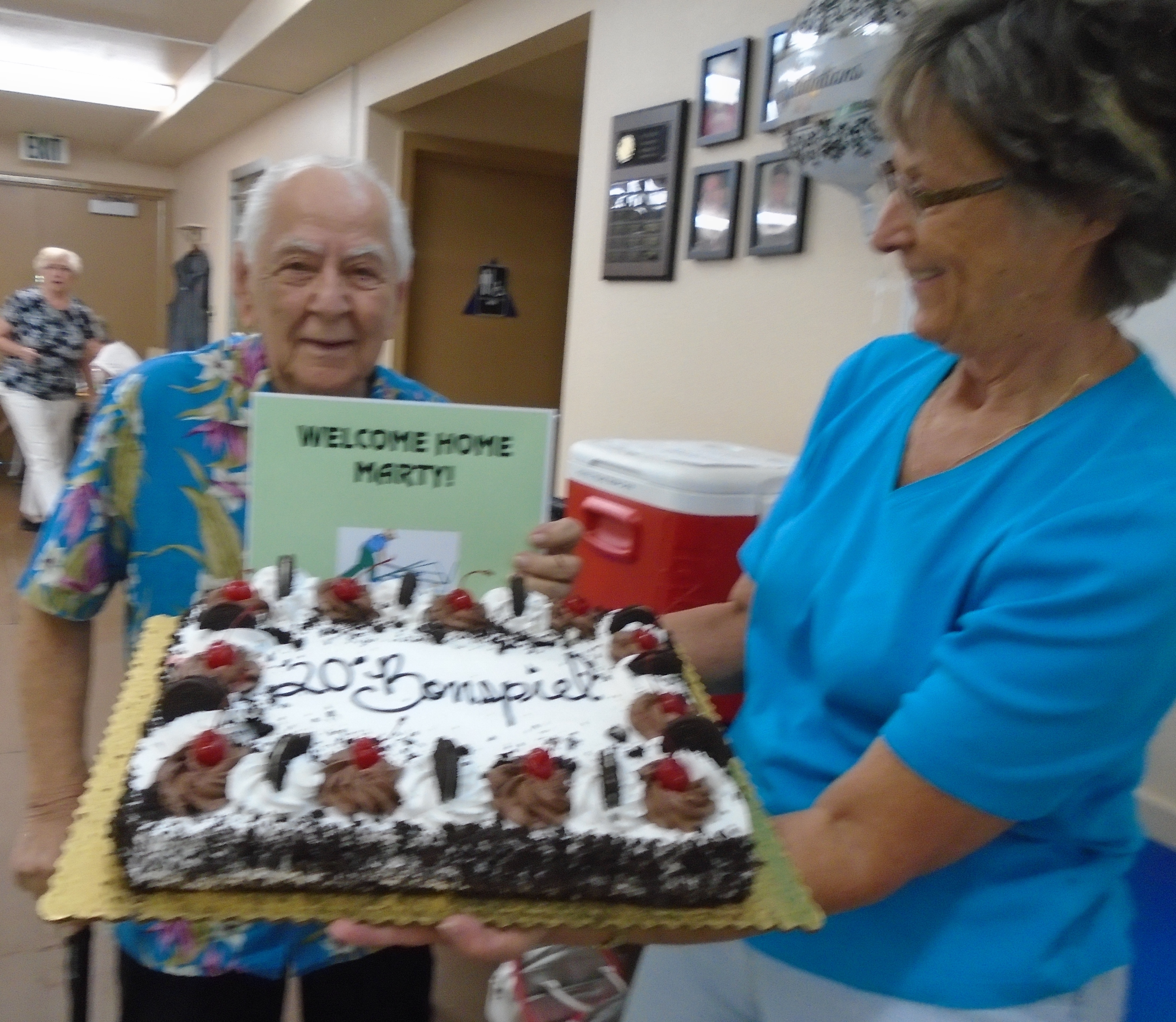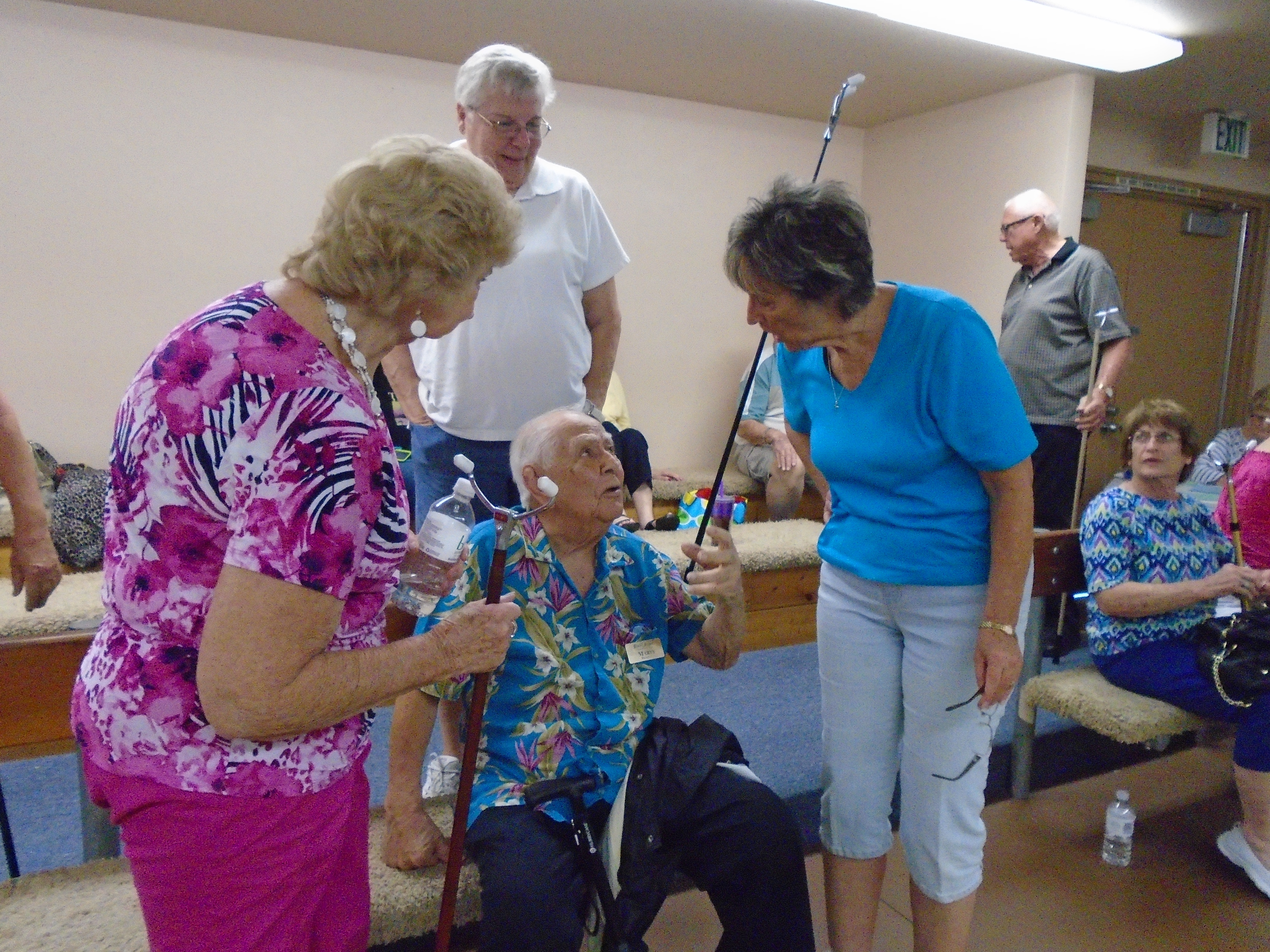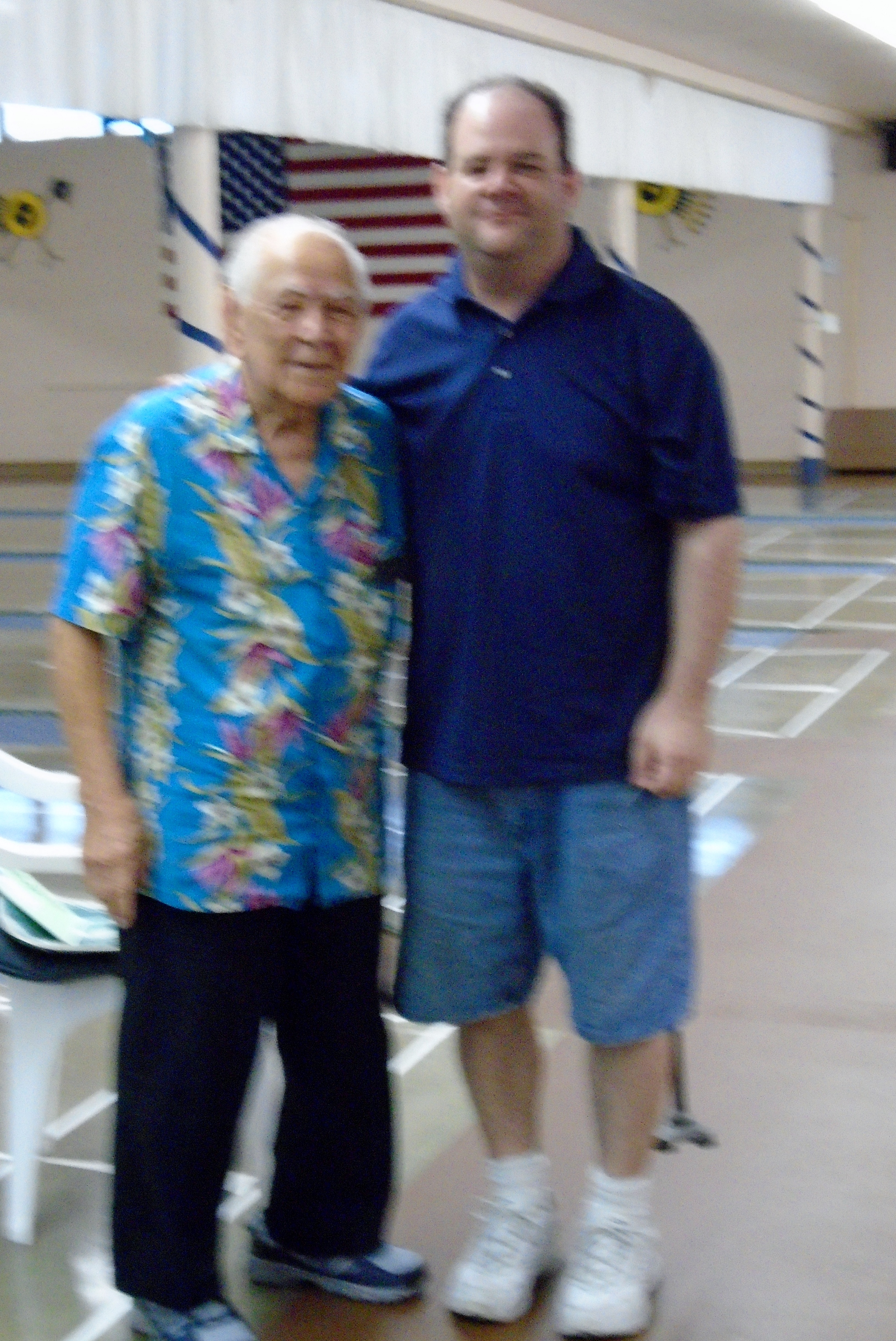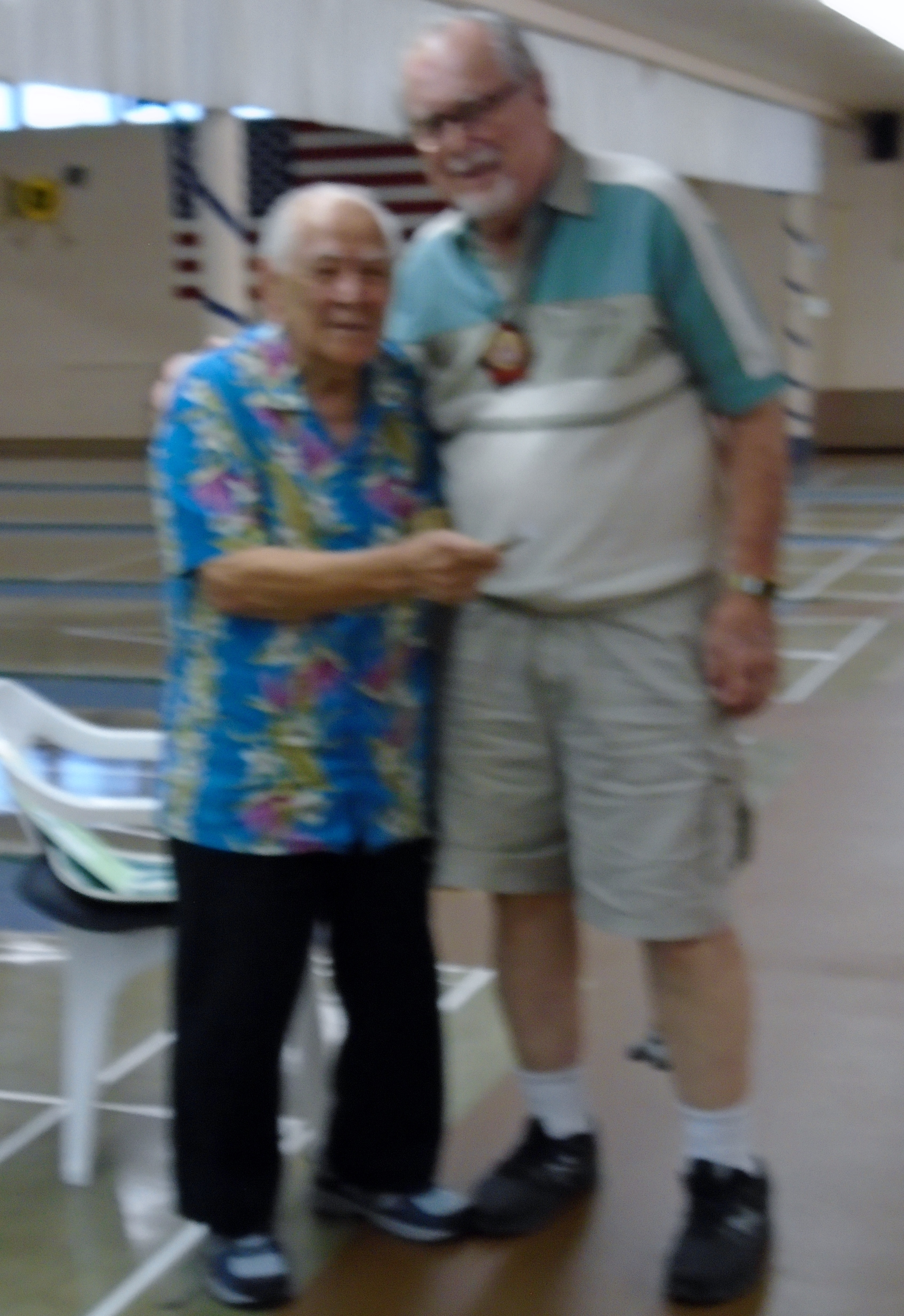 The 20th Annual Bonspiel Shuffleboard Tournament was held on July 13th, through July 15th, at Hemet Municipal Shuffleboard Courts. Atm’s in Charge of the scheduling and recording the results of each game were District 7 Tournament Director Sharyn DiChiro and her assistant Lynda Goggin. They did an outstanding job keeping the games running smoothly and on time. As Hemet Municipal Shuffleboard President, Carol Anderson with her expert crew of helpers organized delightful and nutritional lunches each day. Everyone was excited and honored to have the Founder of the Hemet Municipal Bonspiel, Marty Boyajian in attendance and playing once again with all his friends. It was a joyful time for all. The Bonspiel is a very different type of Tournament, which is only played once a year. There are four divisions, decided by wins and losses the first day. No one is ever eliminated, all play two games each day. If you win both games the first day you enter the Red division. If you win the first game and loose the second game you enter the Blue division. Players losing the first game but winning the second game are in the Green Division. Those losing the first two games remain in the purple division. The most appreciated part of the game is there is no penalty for landing in the kitchen. Players may accrue 30 extra spread points each game above their opponents score. Of course your opponent tries to take your scores out. It makes for an interesting and fun game. Players get 2 pts for each win. Final results total up the game winning points and the total of spread points for each player, making the play more equal for all. Carol Anderson assisted by Marty presented the pins to all winners, who will also receive the ever popular Bonspiel vest. The winners for the 2015 20th Anniversary Bonspiel were: