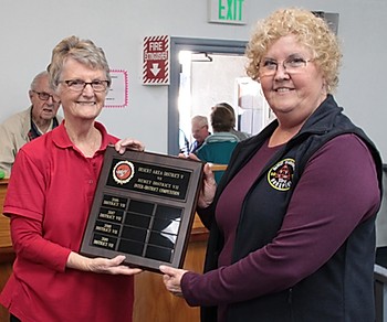 Every year District 5 & 7 compete with each other in the Desert Challenge. This year it was held at The Lakes at Hemet West in Hemet on January18, 2020. It was good fun playing 16 frame games, with Alice Beers (right) being awarded the plaque for the most wins (21-19) from the tournament director Lynda Goggin (left)