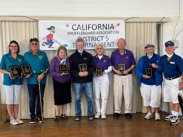 Even though the number of entries was less than when last held in 2020, the enthusiasm and superior play from the 72 shufflers who competed in the Any Doubles Tournament was outstanding. When a decision was made that the annual host of this tournament was not able to hold the tournament at their facilities at Royal Palms in Cathedral City, the Ramon Park Shuffleboard Club offered their facilities in Palm Springs as long as they were not responsible for getting the referees and scorekeepers and they would have help with the boards – not a problem! With representation from 8 of the 9 shuffleboard clubs entered in the tournament, volunteers to “man” the duties of refereeing, scorekeeping and cleaning and waxing the boards went off like clockwork. Ramon Park had just hosted the annual Rookie Tournament a few weeks earlier so their shufflers were now able to focus their help on the food served each day. Everyone was excited when Ramon announced they would be serving their “world-famous” Ramon burgers and the smell of burgers cooking and onions browning during the morning play reminded everyone of what we had missed this past year when Covid had interrupted our shuffleboard season. Mother Nature once again tried to wreck havoc with the tournament by allowing the Santa Ana winds to blow all of the second day of the tournament. With wind wax applied to the boards due to the 40 to 50 mph gusts, many shufflers were having trouble getting their discs to the lag line. One shuffler was heard to say she didn’t worry about going in the kitchen because she couldn’t even get her disc to the lag line.