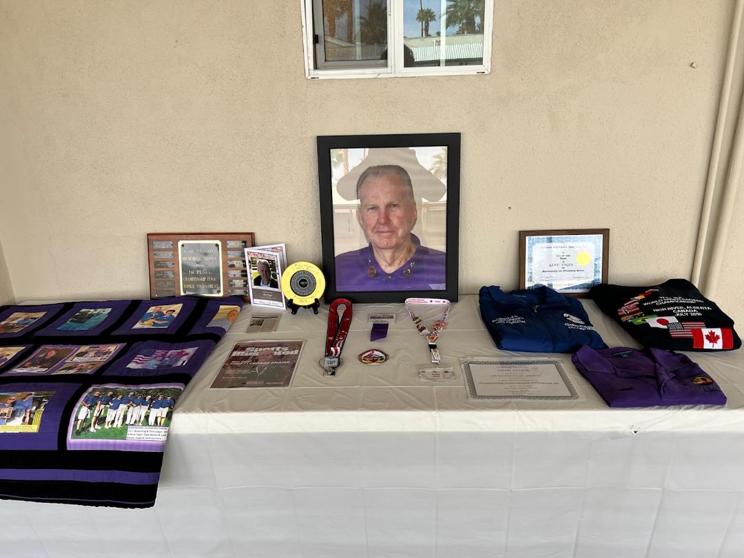 Sixty-eight shufflers competed in the inaugural Gene Eager Memorial Mixed Singles Tournament on January 6 – 8, 2023, at Tramview in Cathedral City. Gene & Shirley’s daughters, Kim Whitcomb and Tina Reed, were present throughout the tournament and set up a display table with Gene’s picture and some of his major accomplishments. Gene started shuffling in 2008 and was the Indian Wells RV Resort Shuffleboard Club President since 2009. He was elected District 5 President in March, 2016, and had been elected President of the California Shuffleboard Association 2 months prior to his death on February 28, 2020. He was inducted into the California Shuffleboard Hall of Fame in 2017 and was a member of one of the 4-person teams that represented the United States at the 37th International Shuffleboard Assn World Shuffleboard Championship in High River, Alberta, Canada in 2018. In 2019, he metaled in the shuffleboard division of the National Senior Games in Albuquerque, NM.