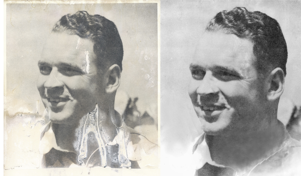 After much manipulation, the Hall of Fame pictures have been digitized, and Photoshop corrected for physical damage, spots, discoloration and stains from water damage. Examples below is before and after extensively reworking the image, for water-stained Dorothee Gragich (1972)