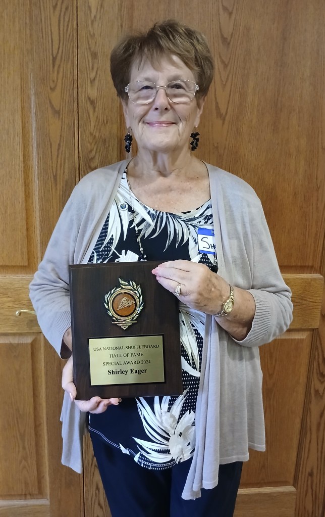 Shirley Eager, CSA District 5’s Secretary/Treasurer and the Chairman of the California Shuffleboard Association Hall of Fame Committee, was honored recently at a banquet and induction ceremony in Lakeside, Ohio. Shirley was inducted into the USA National Shuffleboard Association Hall of Fame in the Special Award Category. To be considered for this prestigious award, a person must have a record of at least ten years in shuffleboard as a player, executive officer, tournament director or otherwise distinguished themselves by an outstanding contribution to the USA National Shuffleboard Association. Shirley’s picture and a plaque with her name on it will be in the USA NSA Hall of Fame in Clearwater, Florida.