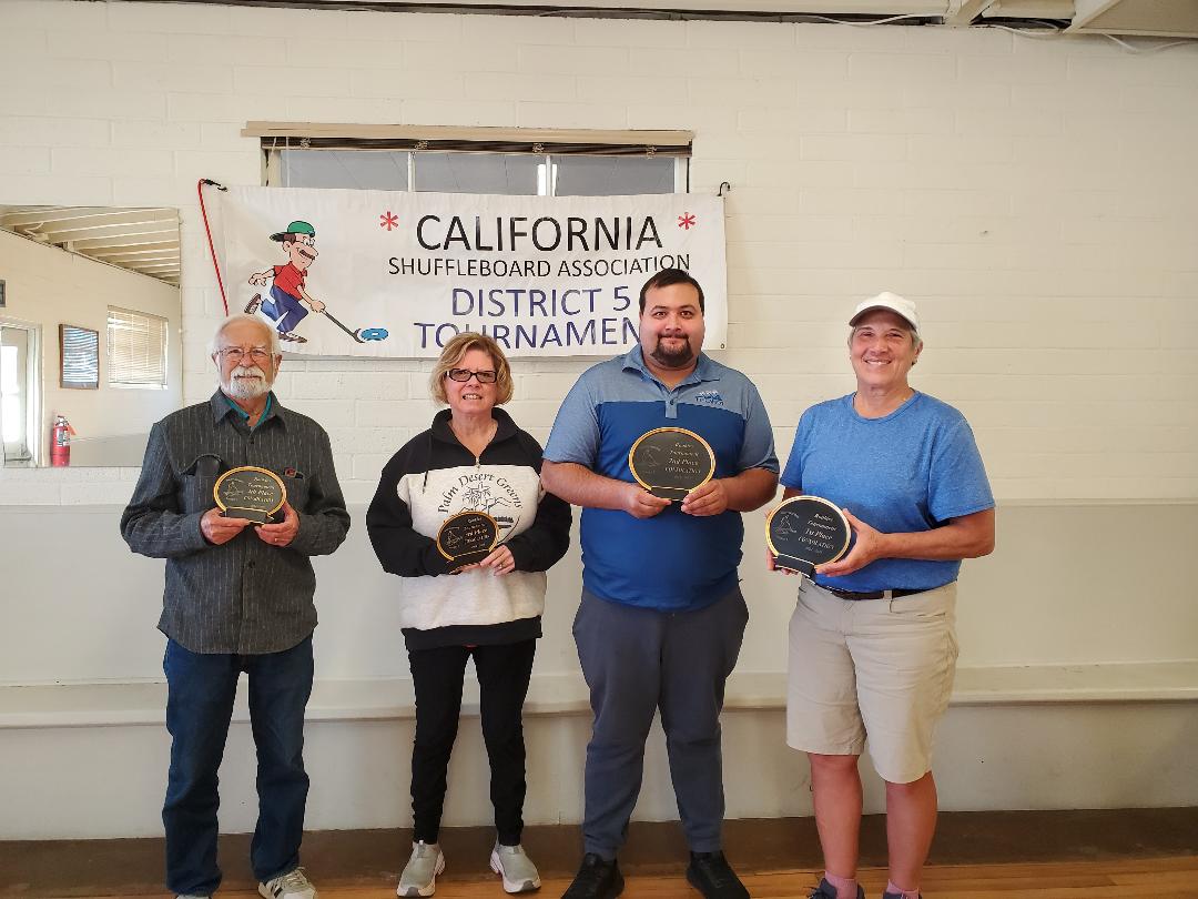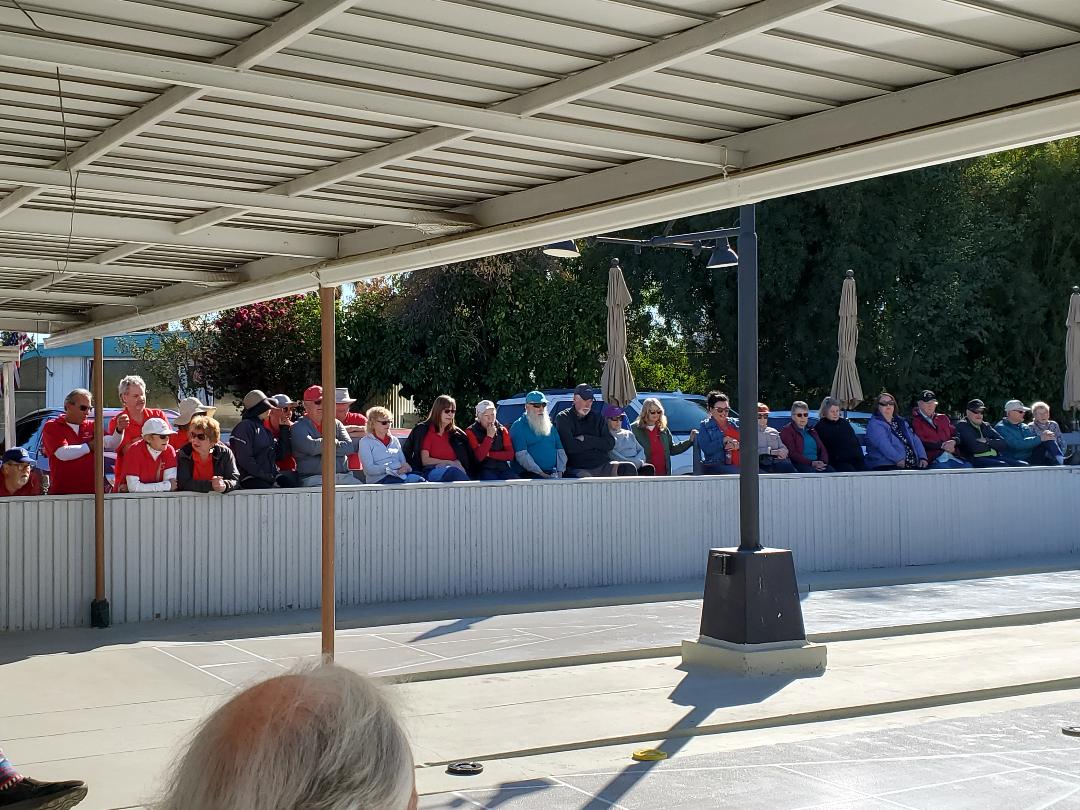 Approximately 70 spectators were viewing the keen competition on the first day of the 2025 District 5 Rookie Tournament at Ramon Park, Palm Springs, CA. Seven of the 9 California Shuffleboard Association District 5 clubs were represented. The second day of the tournament also saw standing-room-only for the spectators.